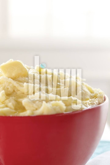 A pat of butter melts over the top of a red serving bowl of mashed potatoes.