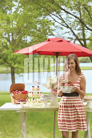 A woman holds a large bowl of fresh strawberries at a picnic near a lake.