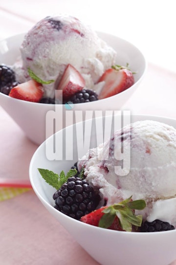 Fruit jam is swirled into homemade ice cream and scooped onto fresh berries.