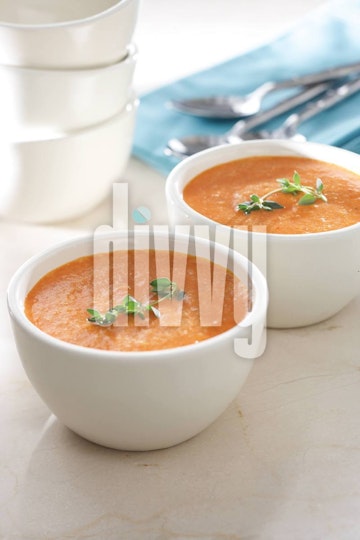Two bowls of creamy roasted tomato soup are dished up and garnished with sprigs of fresh thyme next to a stack of empty bowls and spoons.