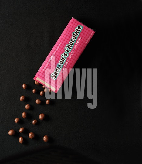 A movie theatre box of chocolates open and spilling on a black table surface.