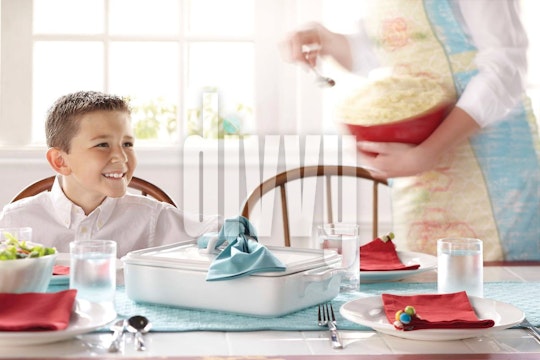 A boy smiles as he looks at a woman serving a red bowl of mashed potatoes.