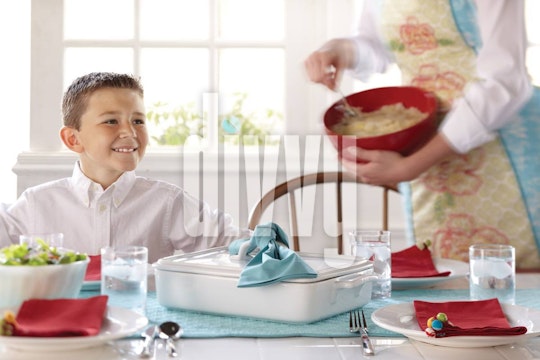 Boy at Dinner Table with Woman Serving Food