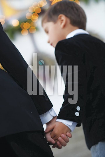 A young boy in dress clothes holds another boy's hand while walking outside.