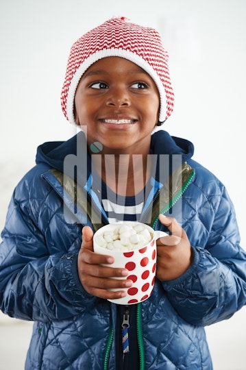 A boy in a winter puffer coat and hat holds a polka dot mug of hot chocolate with marshmallows in front of a white background.