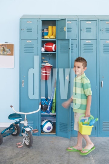 A young boy in summer clothes and sandals carries a bucket of toy gardening tools next to a small teal tricycle and locker system filled with outdoor sports gear.