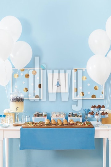 A table is covered with party food and blueberry lemonade, all decorated to match a blue party theme.