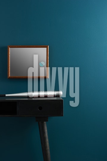 A baseball bat rests on a modern black desk under a framed mirror on a teal wall.