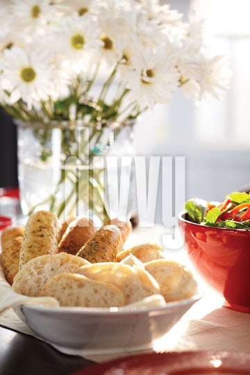 A plate of herb-dusted bread sticks and sliced bread are served next to a salad served in a red bowl, next to a centerpiece of white daisies.