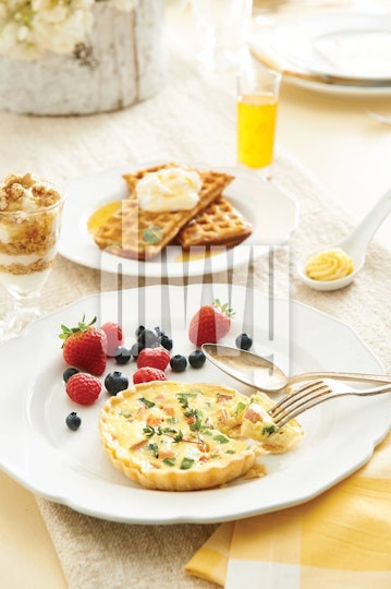 A quiche tartlet is plated with fresh berries, next to a plate holding waffles with syrup and whipped cream.