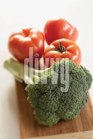 A head of broccoli and three freshly-washed tomatoes are gathered on a bamboo cutting board.