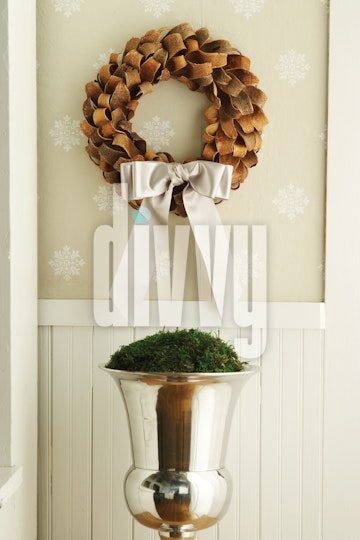 A brown bark wreath is adorned with a large white satin bow and hung over a silver urn filled with vibrant green moss.