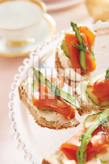 Whole grain bread is topped with a cheese spread, cucumber slices, smoked salmon, asparagus and a sprig of dill for a plate of tea sandwiches.