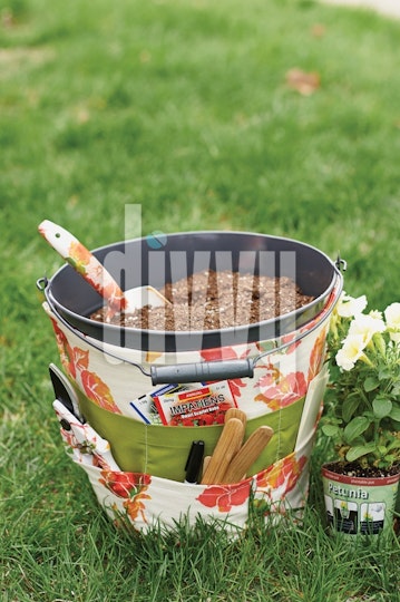 A metal bucket full of planting soil with a pocket organizer around it sits next to petunias in a grassy backyard.