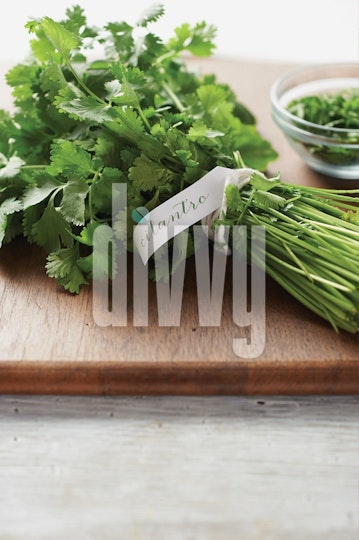 A bunch of fresh cilantro tied with string on a wood cutting board next to a small dish of chopped cilantro.