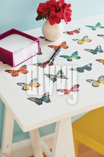 A yellow chair sits in front of a butterfly decorated white desk with a vase of flowers, pen and magenta box of envelopes set in front of a light blue wall.