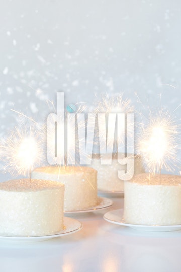 Sparkler candles top four small white frosted cakes in front of a light blue background.