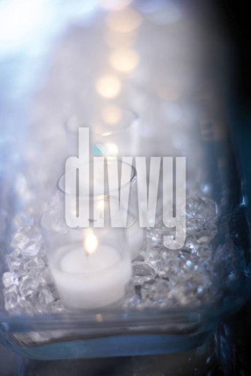 A line of votive candles is anchored in clear stones for a centerpiece arrangement.