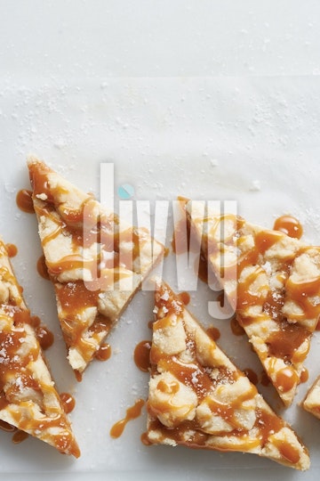 Flaky salt tops triangular dessert bars drizzled with caramel on white parchment paper.