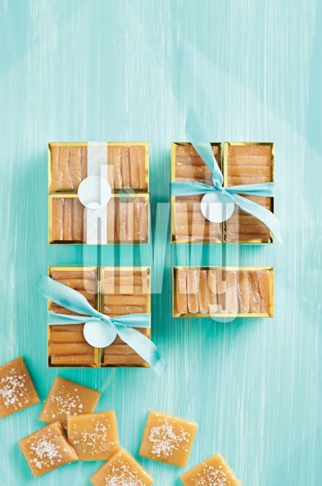 Homemade caramels are packaged with boxes and ribbon for gift-giving.