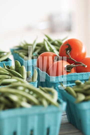 Blue cartons of fresh green beans and vine-ripened tomatoes.