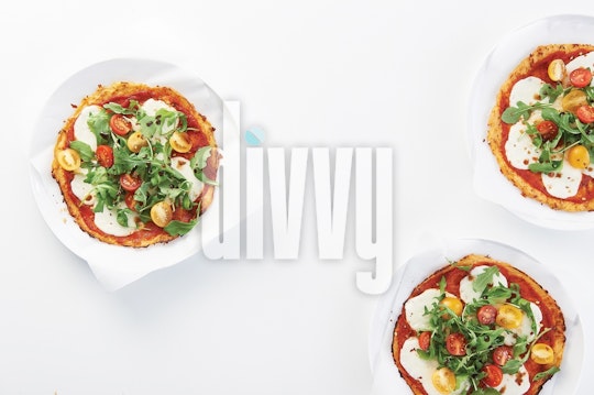 Three individual cauliflower crust pizzas with mozzarella, tomatoes and arugula are served on white plates.