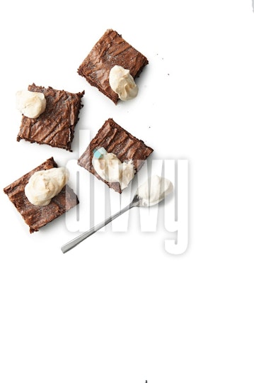 Four fudge-y brownie squares are topped with a homemade chai whipped cream and sprinkled with chai powder.
