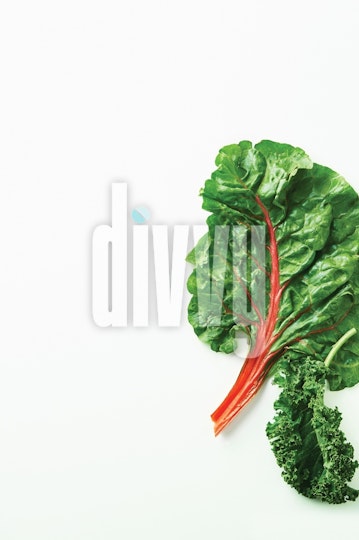 A kale leaf and a chard leaf with a red stem overlap on a white surface.
