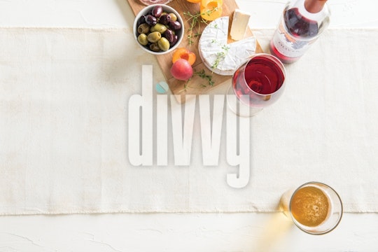 A brie cheese topped with a fresh rosemary is served with fresh sliced apricots, a bowl of black and green olives and thyme sprigs on a wood cutting board near a bottle and glass of red wine and a pint glass of beer on the side on a canvas table runner.