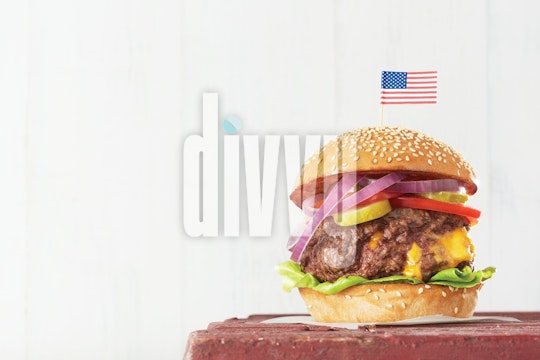 A lava flow cheeseburger stuffed with Cheddar cheese held together with an American flag toothpick is served on a picnic table in front of a white wood background.
