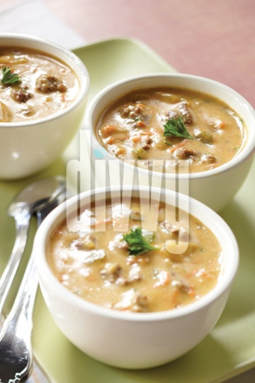 Three bowls of cheeseburger chowder topped with parsley are gathered on a green tray.