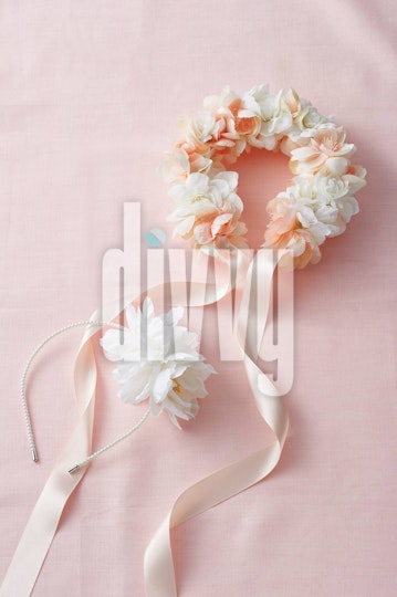 A cherry blossom crown covered in cherry blossoms and mini roses next to a headband embellished with a single large blossom.