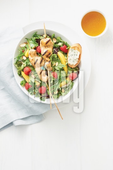 Two grilled chicken skewers and a blue cheese toast top a bowl of salad made with fresh mixed greens, mango, raspberries, and slivered almonds sitting on a white surface next to a ramekin of vinaigrette.