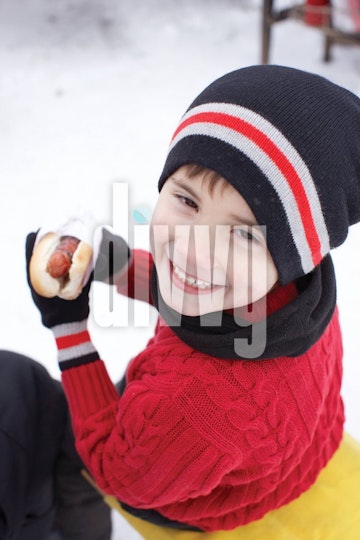 Young boy wearing a red sweater and multicolored hat, holding a hot dog sitting on a yellow chair in the snow.
