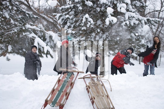 Five children in hats, coats and gloves throwing snowballs near two sleds with trees behind them.