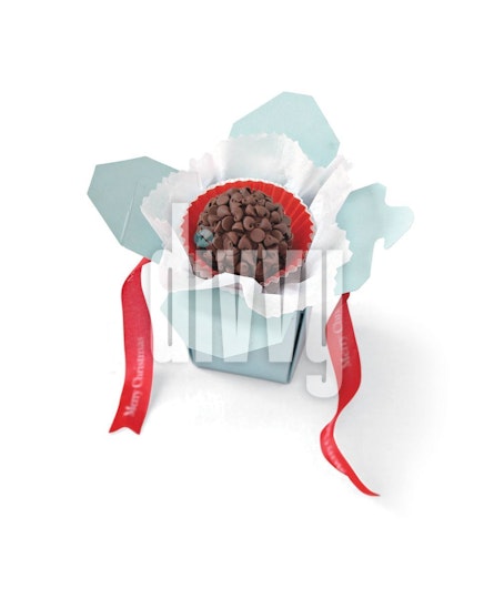 A chocolate chip covered truffle sits inside a paper liners inside a blue gift box tied with a red ribbon Merry Christmas ribbon.