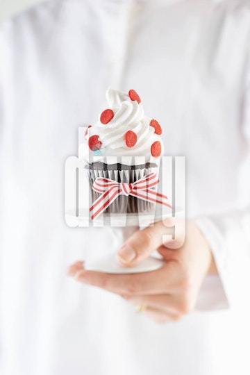 A person holds a tiny cake stand with a chocolate cupcake decorated with white frosting and red dots.