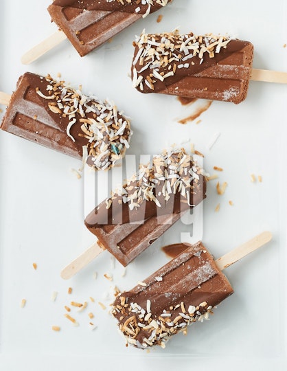 five freezer pops made from coconut milk and cocoa are dipped in a chocolate coating and topped with coconut shavings.