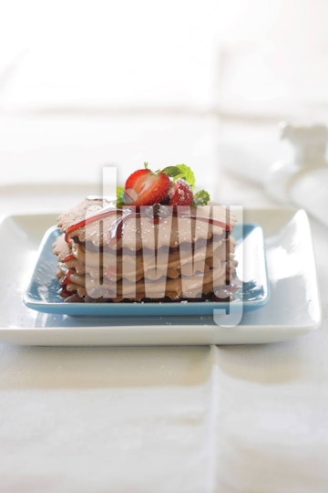 Three chocolate pancakes with a coffee mascarpone filling are topped with fresh berries, chocolate chips, mint and syrup.