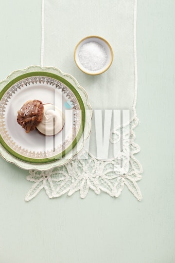 A salted caramel and chocolate cream puff with a vanilla cream filling sits on an ornage green-and-gold edged plate.