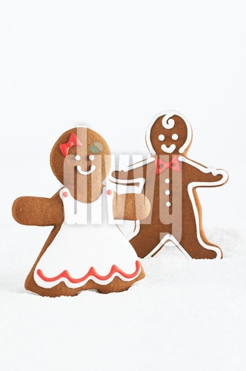 Two soft gingerbread cookies, one gingerbread man and one gingerbread woman, are decorated with red and white royal icing and arranged in a bed of sugar.