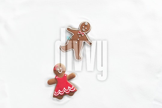 A gingerbread man and a gingerbread woman decorated with red and white royal icing sit in a bed of sugar.