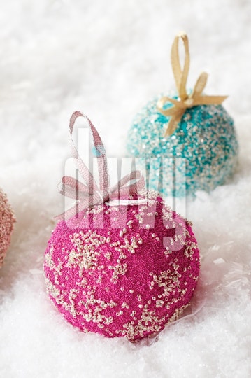 Colorful hand-made beaded Christmas ornaments rest on a snowy surface.