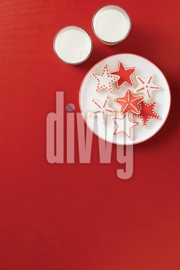 Seven star cutout Christmas cookies decorated with red and white royal icing served with two glasses of milk; overhead shot; red background