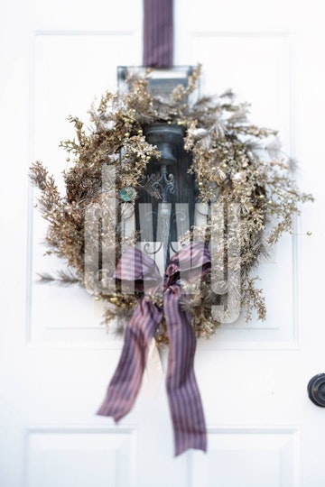 Gold Wreath Hanging on a White Door