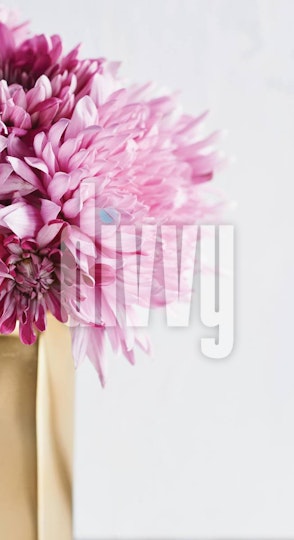 A square gold vase holds an arrangement of pink chrysanthemums.