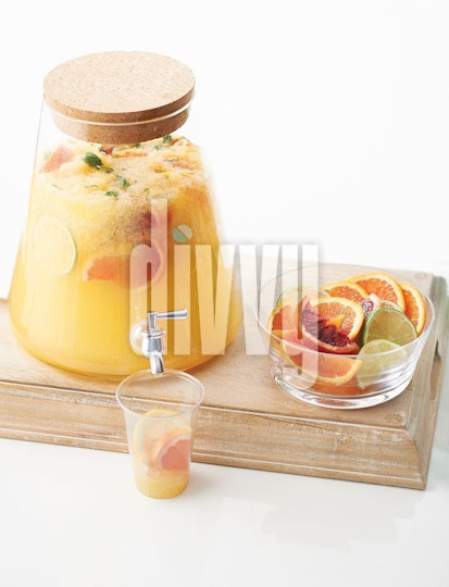 A glass filled with citrus slices wait to be filled under the spigot of a glass beverage container filled with a slushy citrus punch, orange and lime slices and mint leaves next to a small glass dish of freshly sliced citrus.