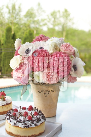 A chocolate and raspberry cheesecake sits next to a floral arrangement of hydrangeas, anemones and ranunculus in a clay pot.
