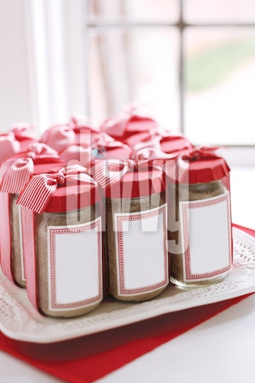 A group of large clear mason jars are filled with cocoa mix and topped red lids, striped ribbon and white labels in front of a window.