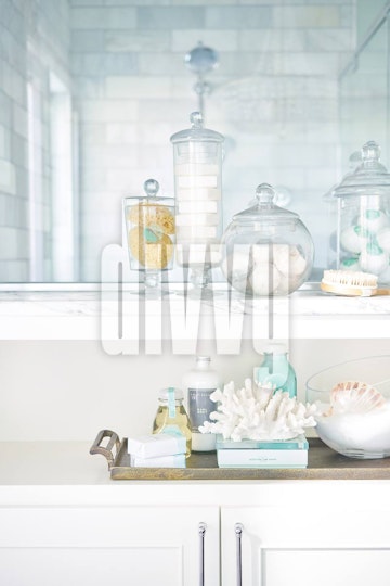 Bathroom products, such as soaps, sponges, bath bombs and lotions are organized in apothecary jars and on a tray in front of a marble-tiled shower.